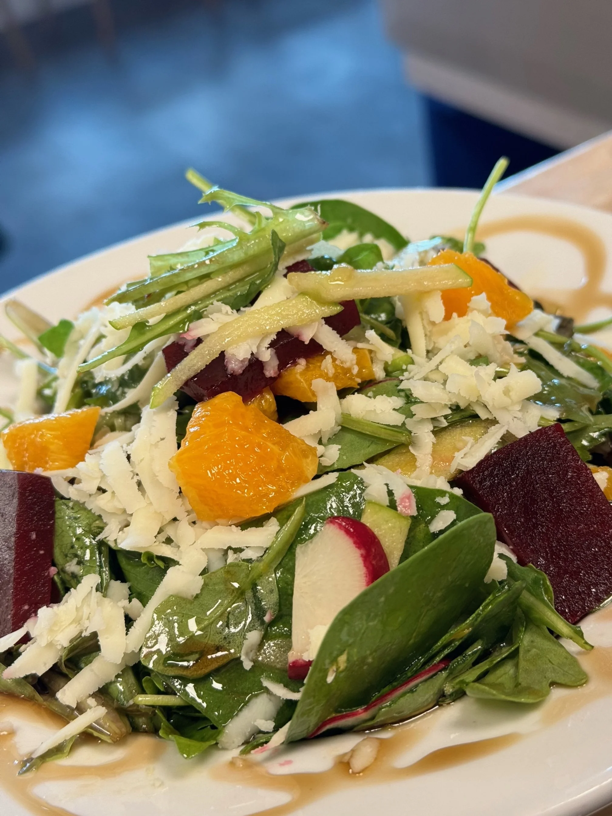 Mevsim Salata seasonal greens, marinated beets, green apple, orange, with cheese*, pomegranate molasses vinaigrette (Vg, GF) $15