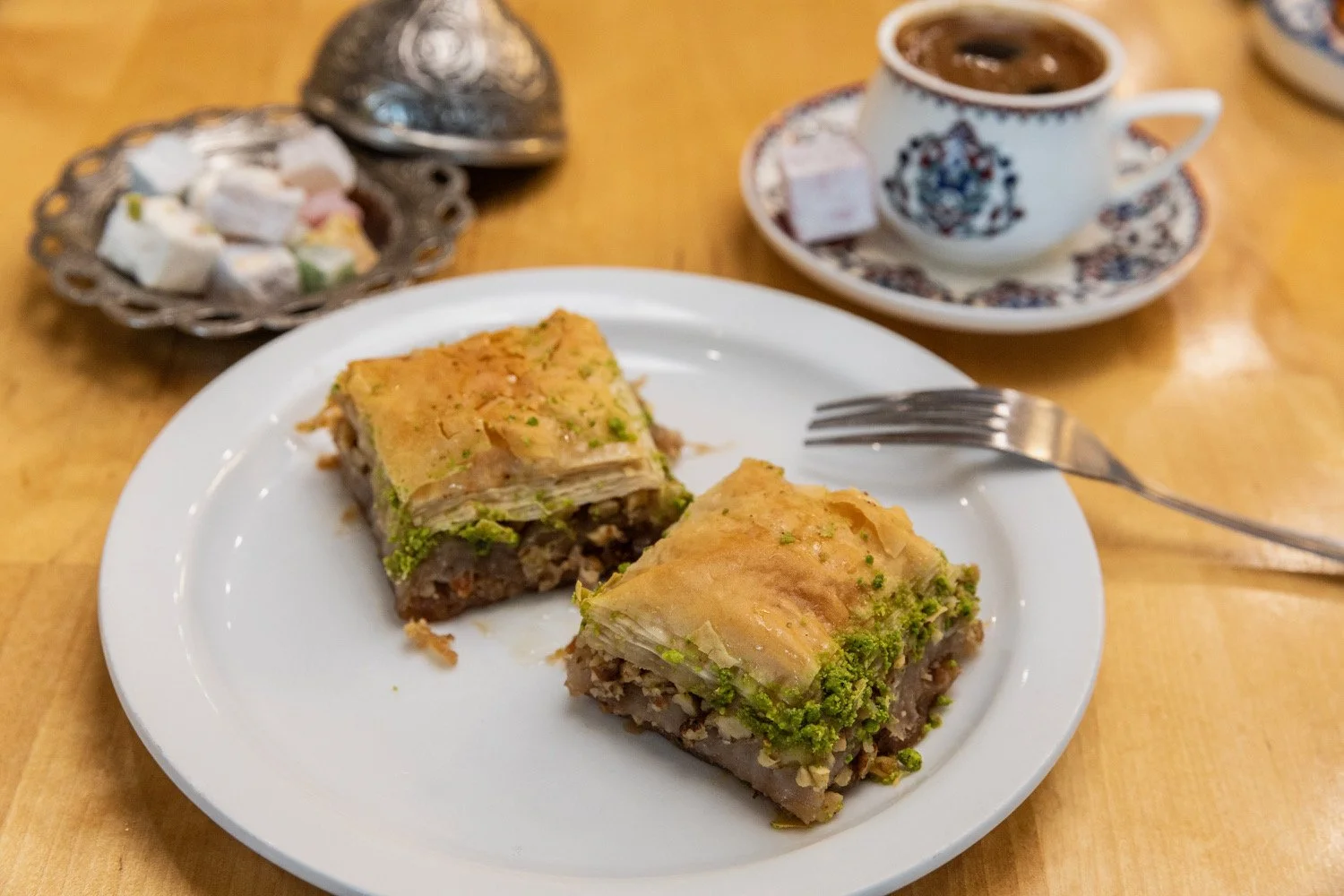Baklava phyllo dough with walnuts in simple syrup, with Antep pistachios (N) $7 (2 pieces)